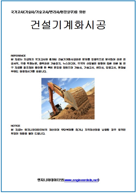 이 서적은 국가고시(기술사/기술고시/변리사/현장실무)를 위한 건설기계화시공서적은 지금까지 국가고시에 출제된 건설기계화시공관련 문제를 집중적으로 분석하여 관련 전공서적, 각종 학회논문, 종목관련 기술잡지, 뉴스미디어, 각국의 산업발전 동향에 따른 이론 및 연구 자료를 참조하여 풀이를 한 후에 편집을 하였으며 기술사, 기술고시, 변리사, 임용고시, 현장실무에도 활용하시기를 바라며 구입을 원하시거나 상담을 원하시면 이메일 edn@engineerdata.net, 혹은 033-452-9081로 전화를 주시면 상세하게 안내하여 드립니다.