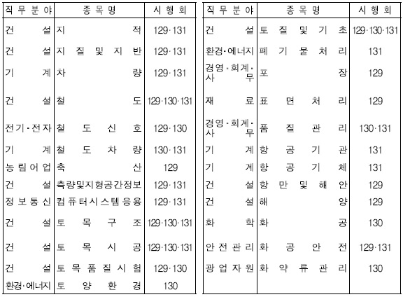 철도차량기사, 궤도장비정비기사, 해양공학기사, 해양자원개발기사, 농업기계기사, 제품디자인기사, 섬유기사, 수산제조기사