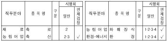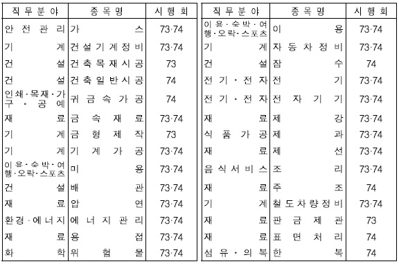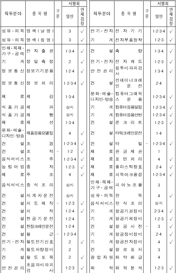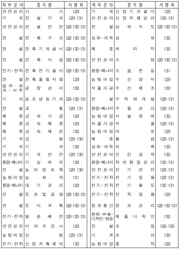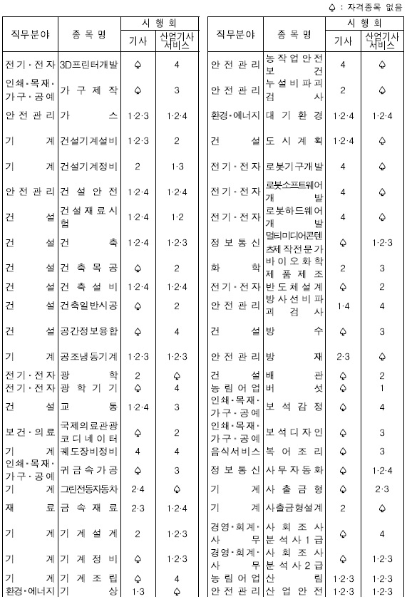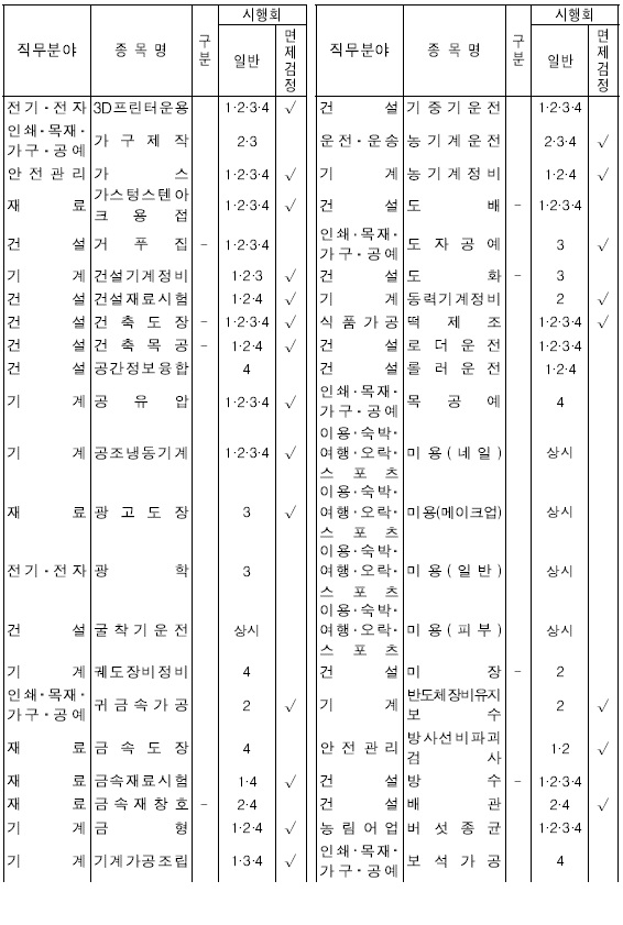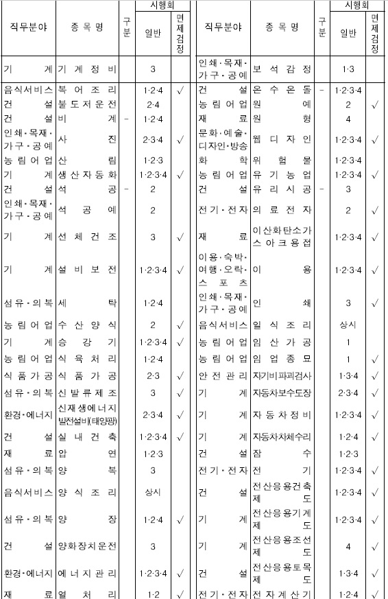 ※ 아래표중시행구분의“-”는필기시험이없는종목, 시행회의“상시”는상시시행종목