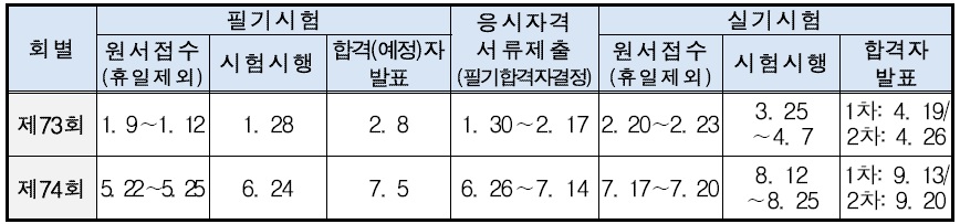 - 토요일: 기능장 제74회, 기사(산업기사·서비스) 제2회·제3회, 기능사 제2회·제3회