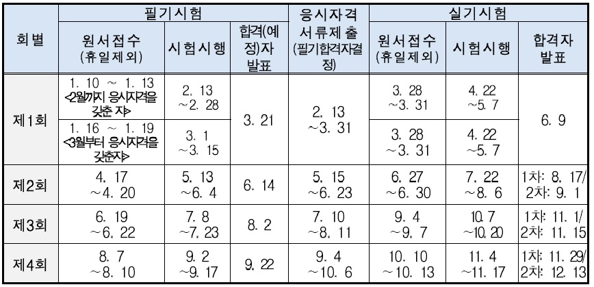 - 일요일: 기능장 제73회, 기사(산업기사·서비스) 제1회·제4회, 기능사 제1회·제4회