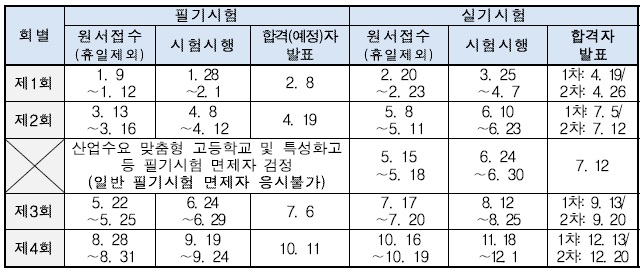 * 단, 산업수요 맞춤형고등학교 및 특성화고등학교 등 필기시험 면제자 검정은 시험이 시작되는 첫 번째 평일 시행