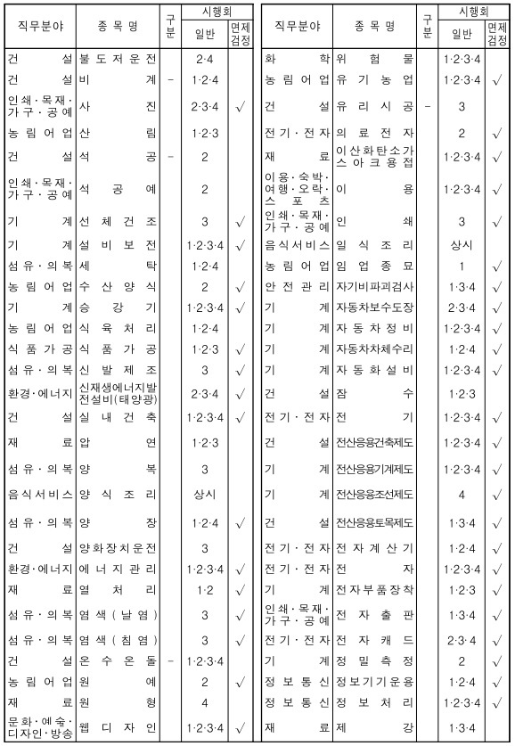 ※ 아래표 중 시행구분의 “ ”는 필기시험이 없는 종목, 시행회의 “상시”는 상시시행종목