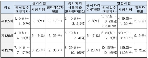 ※ 수험인원이 극히 저조하거나 시험상황에 따라 실시하지 않을 수 있으며, 실기시험은 접수 시점에 필기시험 면제기간이 만료되지 않는 경우에만 원서접수 가능