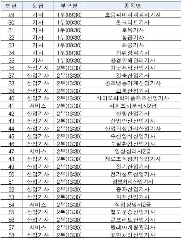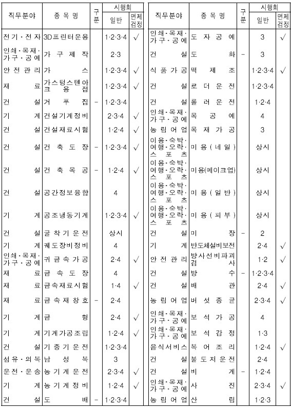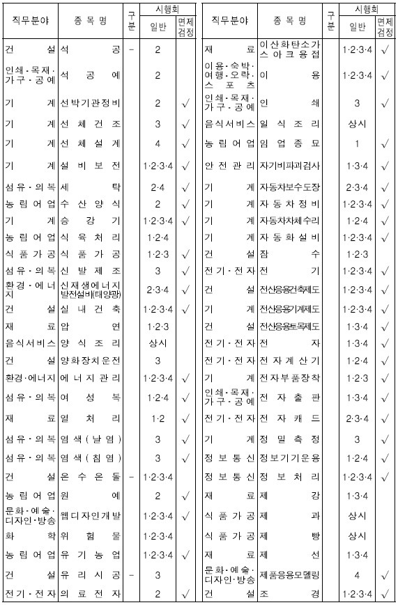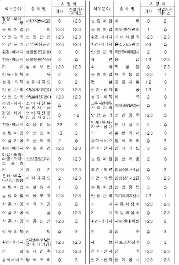 ※ 아래표 중 시행구분의 “-”는 필기시험이 없는 종목, 시행회의 “상시”는 상시시행 종목