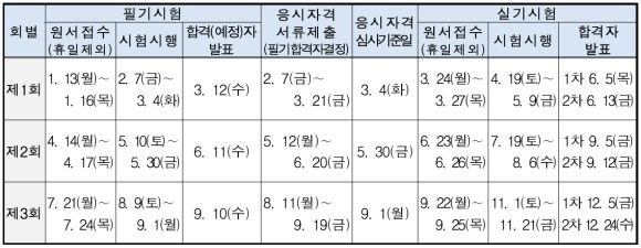 ※ 수험인원이 극히 저조하거나 시험상황에 따라 실시하지 않을 수 있으며, 실기시험은 접수 시점에 필기시험 면제기간이 만료되지 않는 경우에만 원서접수 가능