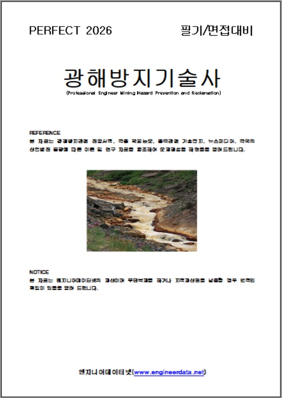 2026년 필기/면접대비 광해방지기술사 해설집을 2025년 137회까지 출제문제와 예상문제, 참고자료를 업데이트하여 판매하니 edn@engineerdata.net으로 문의하시거나 033-452-9081으로 전화를 주시면 샘플과 함께 상세하게 안내하여 드리며 하기 목차는 지금까지 출제된 문제를 풀이하여 답안지 형식으로 전개한 것입니다.