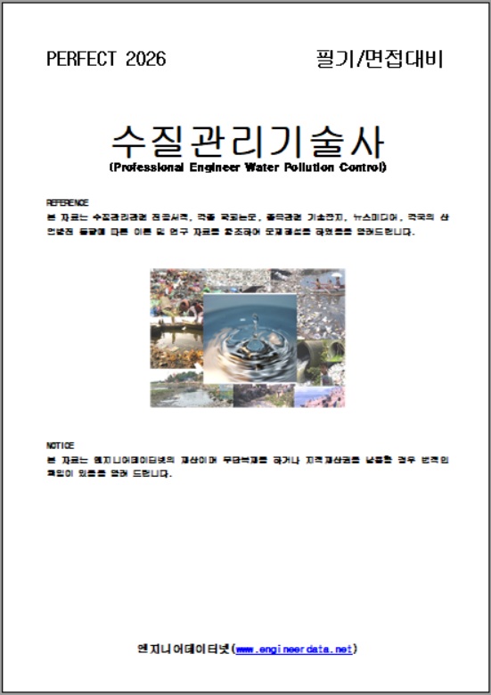 2026년 필기/면접대비 수질관리기술사 해설집을 2025년 137회까지 출제문제와 예상문제, 참고자료를 업데이트하여 판매하니 edn@engineerdata.net으로 문의하시거나 033-452-9081으로 전화를 주시면 샘플과 함께 상세하게 안내하여 드리며 하기 목차는 지금까지 출제된 문제를 풀이하여 답안지 형식으로 전개한 것입니다.