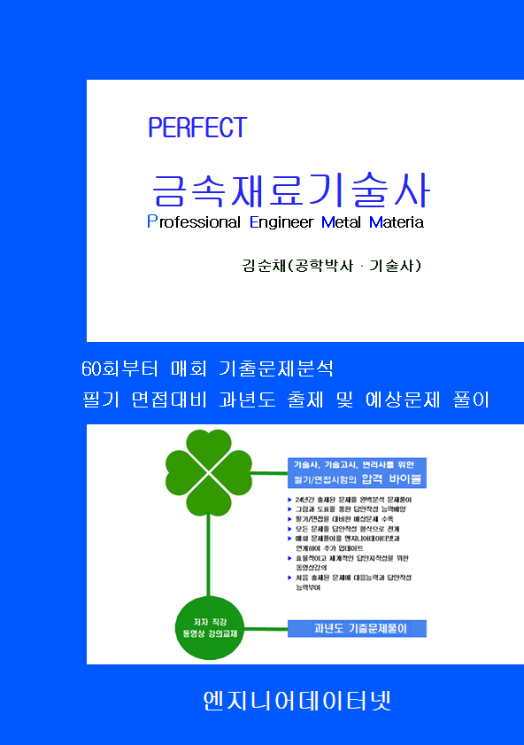 금속재료기술사는 24년동안 1년에 1회로 출제되는 기출문제를 출제기준에 따라 분류하고, 과년도 기출문제를 풀이를 핵심내용을 요약하여 모든 문제를 A4 기준하여 1페이지나 1페이지 반정도 요약하여 답안지 형식으로 서술을 하였습니다. 지금까지 상담한 여러 내용을 검토하여 가장 단기간에 합격하는 방법을 제시하고 있습니다. 또한, 종이서적만 판매하는 스마트 금속재료기술사